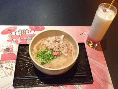 Die zweite Kombination besteht aus „Wildschwein-Shabu-Shabu Sakura Udon" und der alkoholischen Version des „Celebratory Tri-color Cocktails".