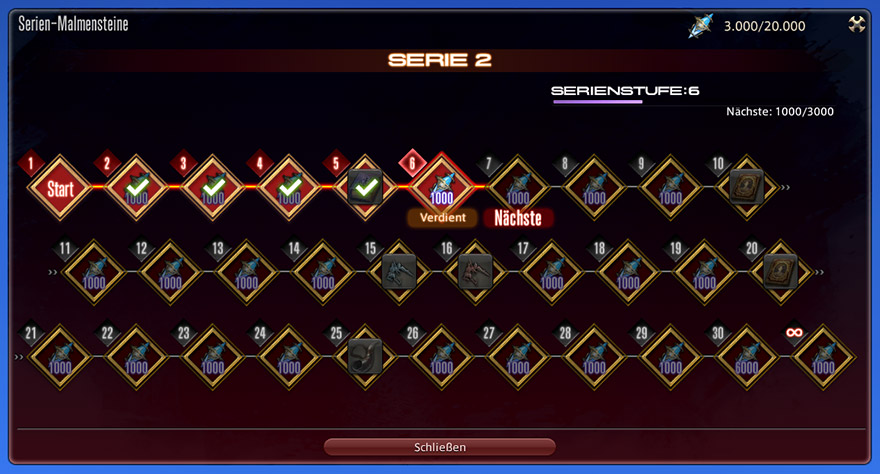 Das Erreichen von Serien-Malmensteinen bringt Belohnungen ein, je höher die Serienstufe ist.