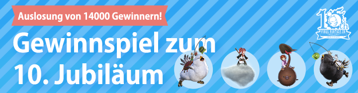 WICHTIG! Bitte lest euch die vollständigen Regeln und Teilnahmebedingungen zum FINAL FANTASY XIV „Gewinnspiel zum 10. Jubiläum von FFXIV: ARR“ (die „Aktion“) aufmerksam durch, bevor ihr am Gewinnspiel teilnehmt. Mit eurer Teilnahme am Gewinnspiel stimmt ihr den offiziellen Gewinnspielregeln eures Gebiets und den allgemeinen Bestimmungen der Aktion zu.