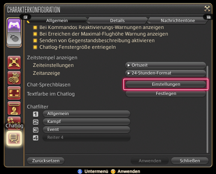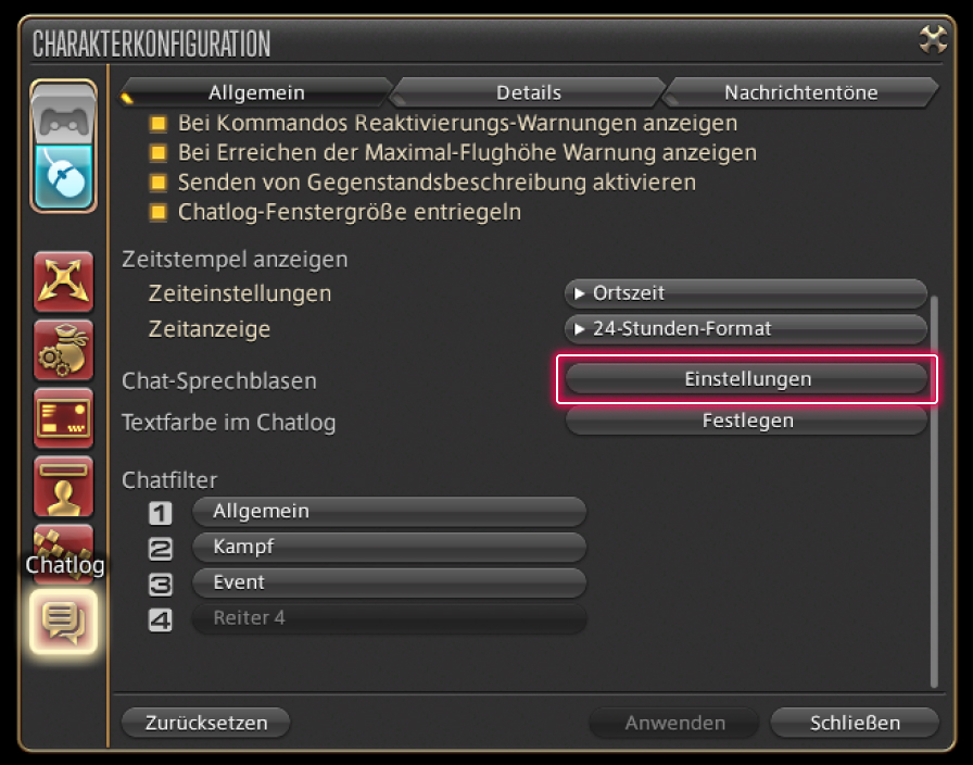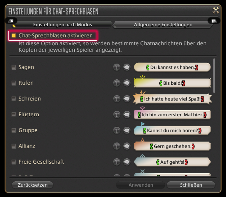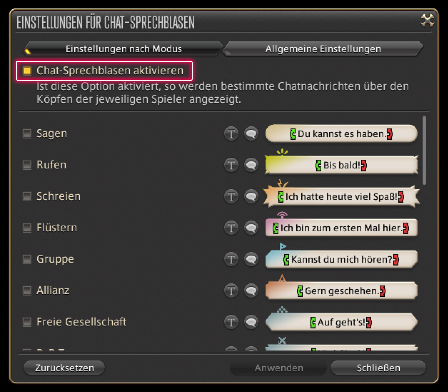 Die Sprechblasen-Funktion zeigt bestimmte Nachrichten über den jeweiligen Köpfen von Charakteren im Spiel an. Um diese Funktion zu aktivieren, navigiere zu Hauptmenü → System → Charakterkonfiguration → Chatlog. Klicke auf die Schaltfläche „Einstellungen“ neben „Chat-Sprechblasen“ im Reiter „Allgemein“ und markiere das Kontrollkästchen vor „Chat-Sprechblasen aktivieren“.