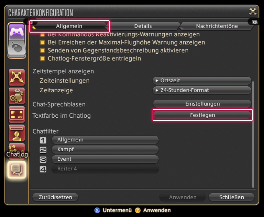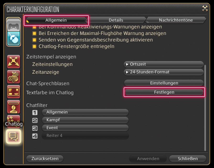 Gehe zu Hauptmenü → System → Charakterkonfiguration → Chatlog-Einstellungen → Allgemein → Textfarbe im Chatlog und wähle „Festlegen".