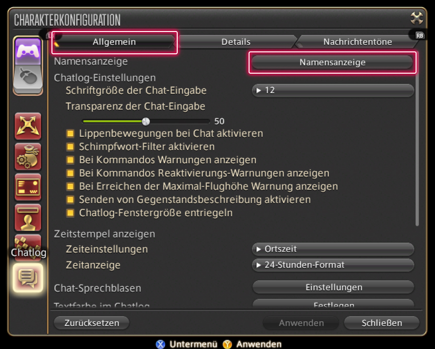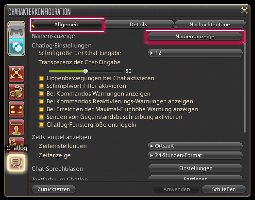 Für die Anpassung der Textfarbe an die jeweilige Rolle des Spielers muss das Fenster „Chatlog: Namensanzeige“ geöffnet werden. Dieses findest du aus dem Hauptmenü unter System → Charakterkonfiguration → Chatlog-Einstellungen → Allgemein → Namensanzeige.