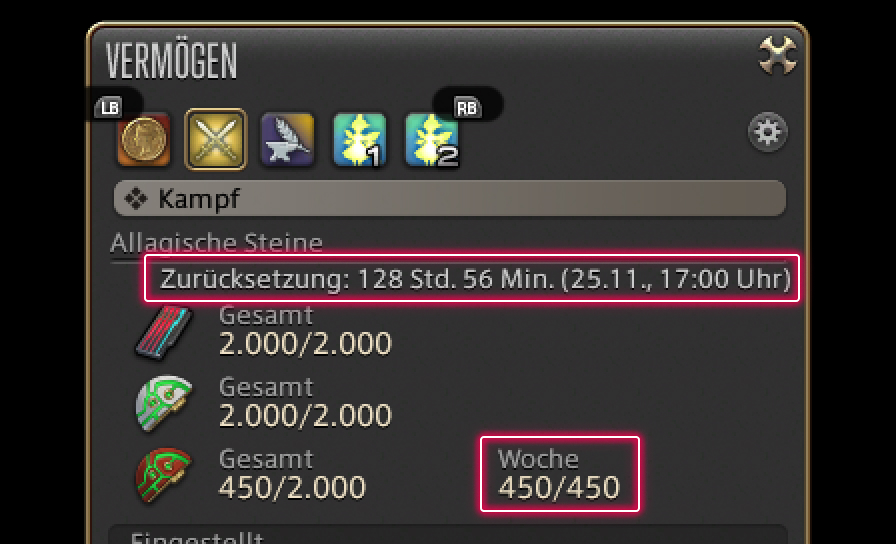 Von bestimmten Arten von Allagischen Steinen können pro Woche nur eine begrenzte Anzahl erhalten werden.