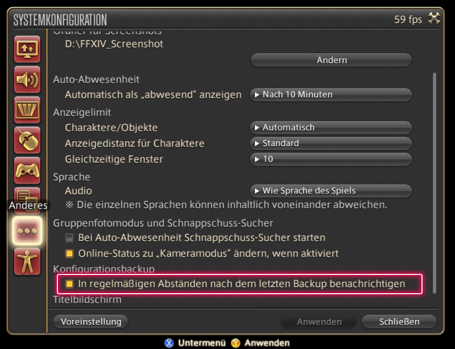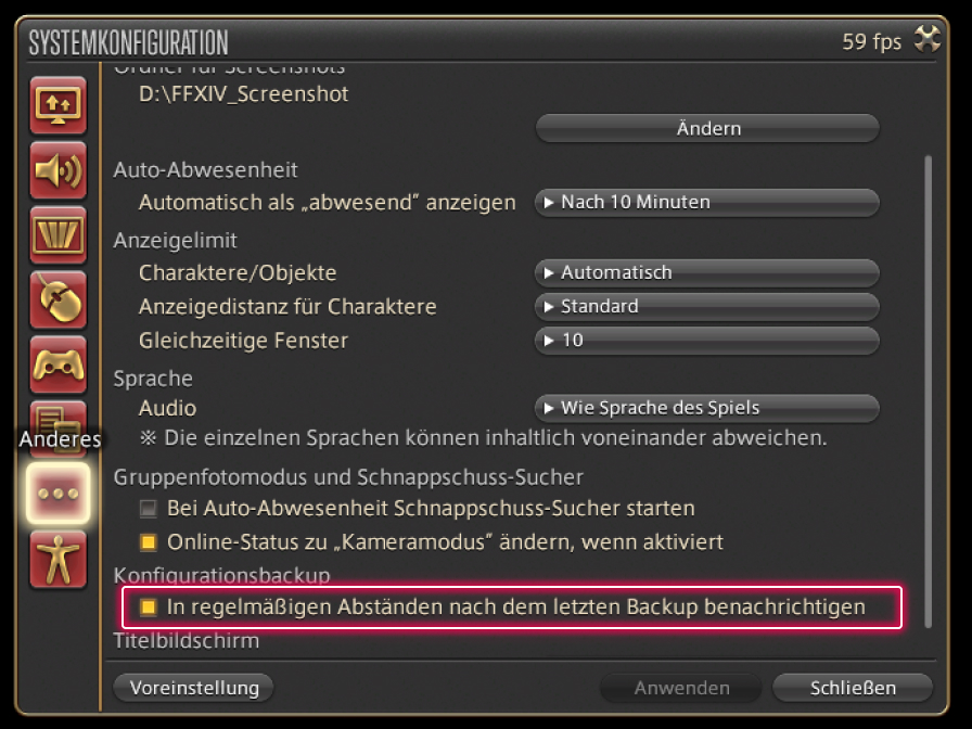 Aktiviere dazu die Option „In regelmäßigen Abständen nach dem letzten Backup benachrichtigen“ (Hauptmenü → System → Systemkonfiguration → Anderes).