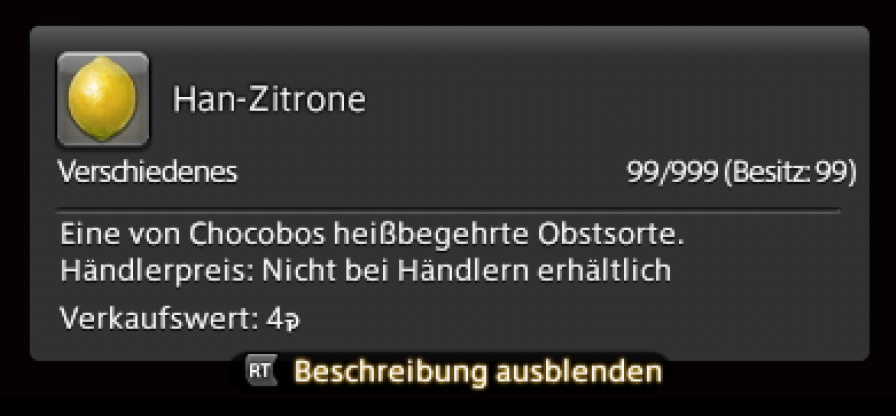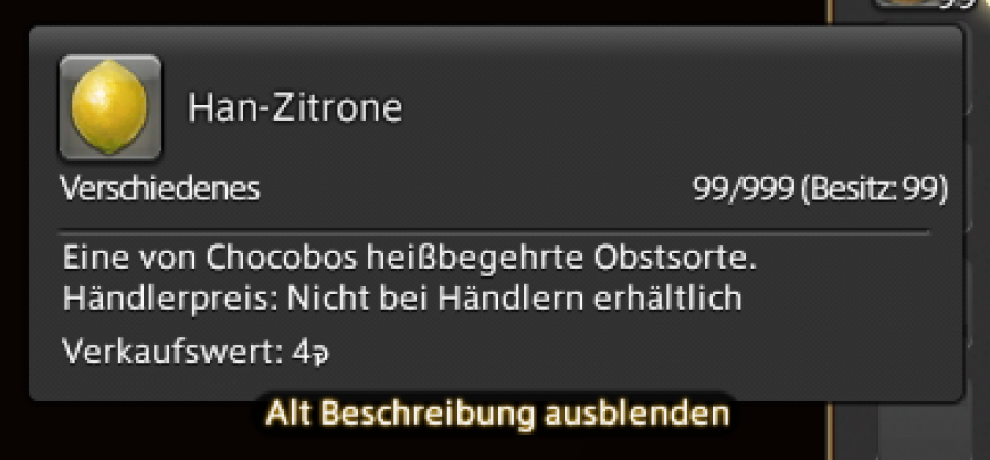 Die Gefiederfarbe eines Chocobos kann zu seiner Ursprungsfarbe geändert werden, indem der Chocobo in einem Chocobo-Stall untergebracht und mit einer Han-Zitrone gefüttert wird.