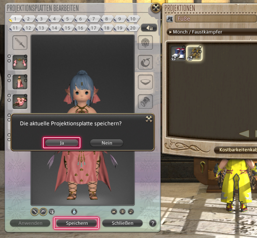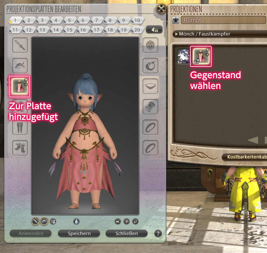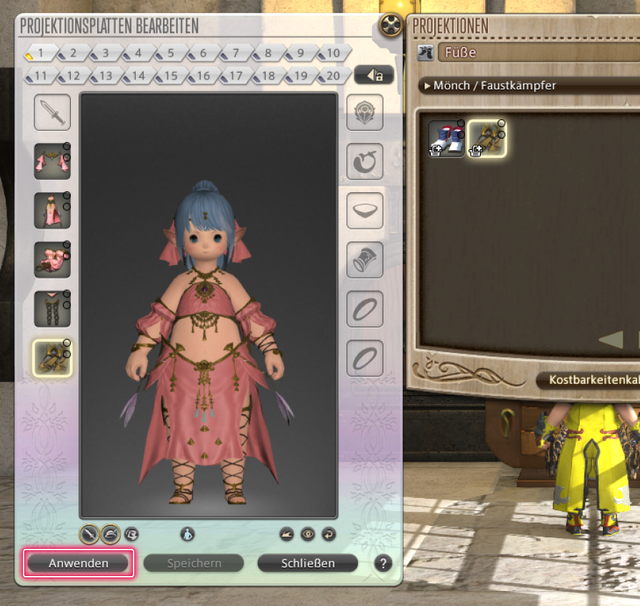 Gegenstände, die in Projektionen umgewandelt wurden, können auf Projektionsplatten zu Kombinationen zusammengestellt und einfach mit einem Mal auf die aktuelle Ausrüstung angewandt werden.