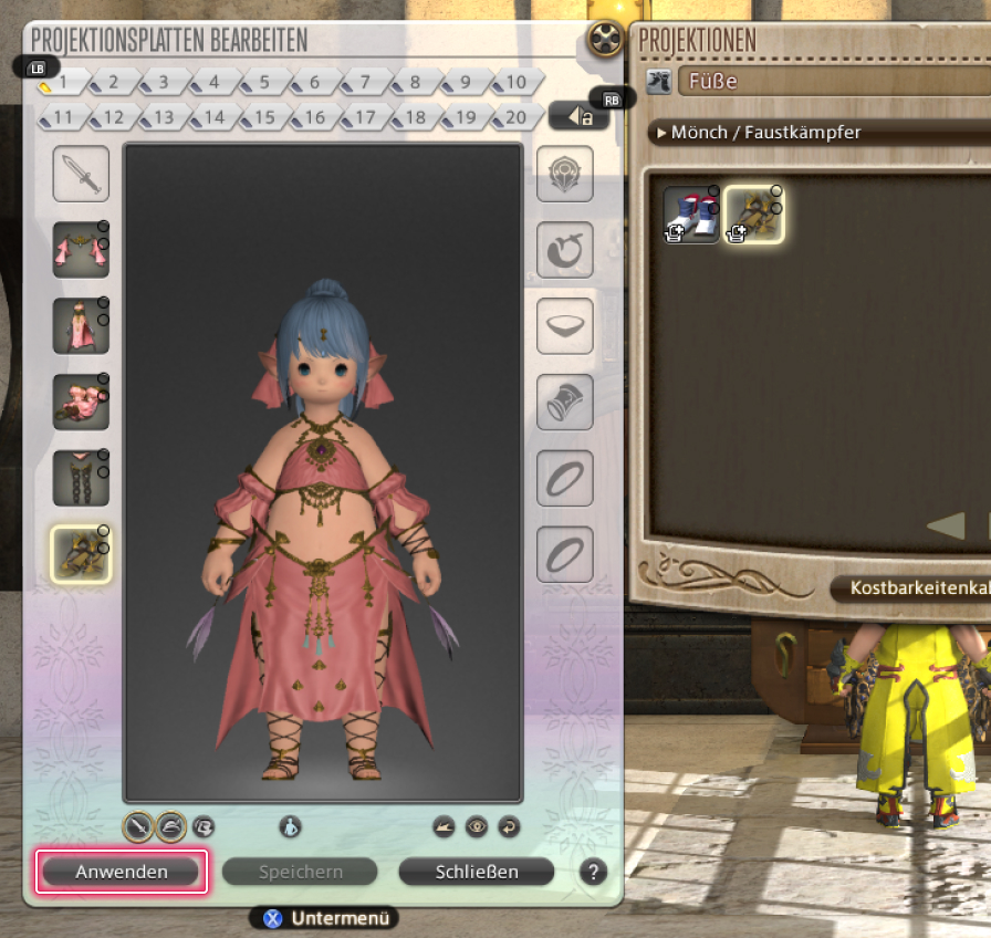 Wähle „Projektionen anwenden“. Die in der Kommode gespeicherten Projektionen lassen sich so direkt auf die aktuell angelegte Ausrüstung übertragen.