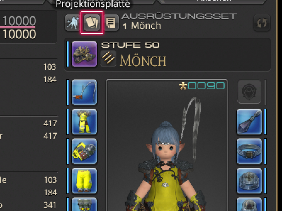 Projektionsplatten funktionieren auch in allen Städten und Wohngebieten sowie in Ruhebereichen im freien Feld. Im oberen Teil des Charakterfensters findest du den Knopf „Projektionsplatten“, mit dem du all deine gespeicherten Sets einsehen und anwenden kannst. So musst du nicht jedes Mal in ein Gästezimmer zurückkehren, um dein Aussehen zu ändern.