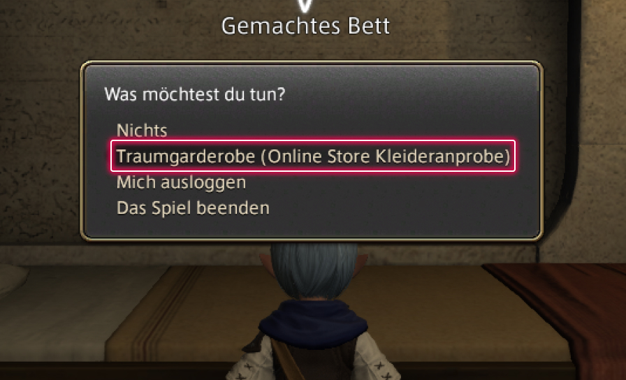Um die Traumgarderobe zu verwenden, begib dich in ein Privatzimmer in einer Herberge und lege dich dort ins Bett. Dort steht dir nun die Option „Traumgarderobe (Online Store Kleideranprobe)“ zur Verfügung.