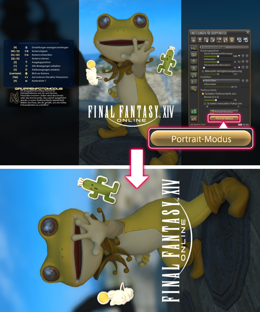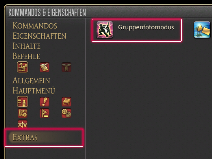 Navigiere zu Hauptmenü → Charakter und öffne die Kommandoliste. Wähle Gruppenfotomodus unter Extras aus. Für leichteren Zugriff kannst du das Kommando auch in dein Kommandomenü ziehen.