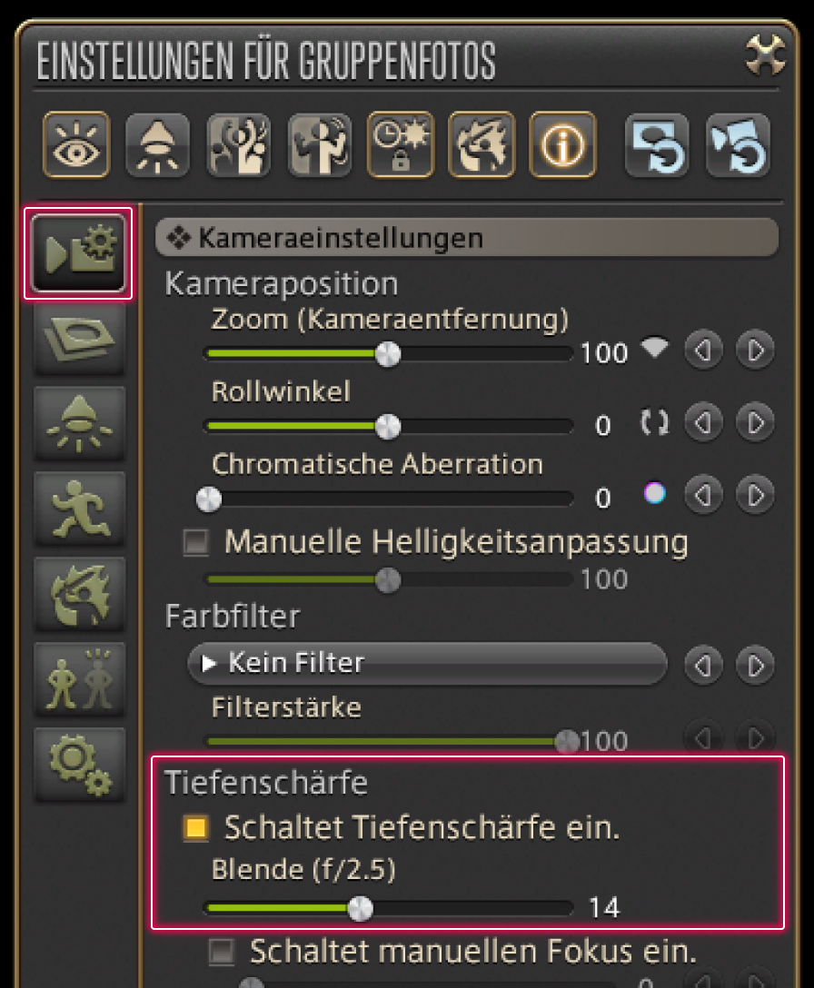 Hinweis: Bitte bedenke, dass bei der Windows®- und der Mac-Version der gewünschte Effekt nicht appliziert wird, solange die entsprechende Funktion nicht auch in den Grafikoptionen der Systemkonfiguration unter „Tiefenschärfe (DOF)“ aktiviert wurde.