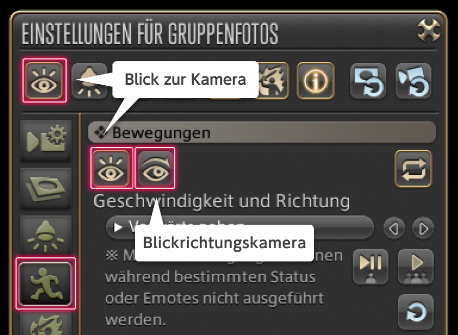 Des Weiteren gib es in den gleichen Einstellungen in der Rubrik „Bewegungen“ eine „Blickrichtungskamera“, mit der sich ausschließlich die Blickrichtung anpassen lässt. So können per Kamerabewegung kecke Seitenblicke verwirklicht werden, die unabhängig von der eigentlichen Kameraposition bei der Aufnahme sind.