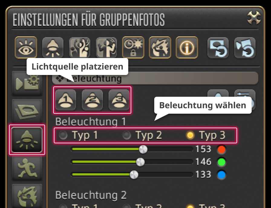 Es können bis zu drei Lichtquellen platziert und für jede eine andere Art von Licht ausgewählt werden. Die Typen unterscheiden sich nach Stärke und Reichweite des Lichts, wobei Typ 1 am schwächsten und Typ 3 am stärksten ist.