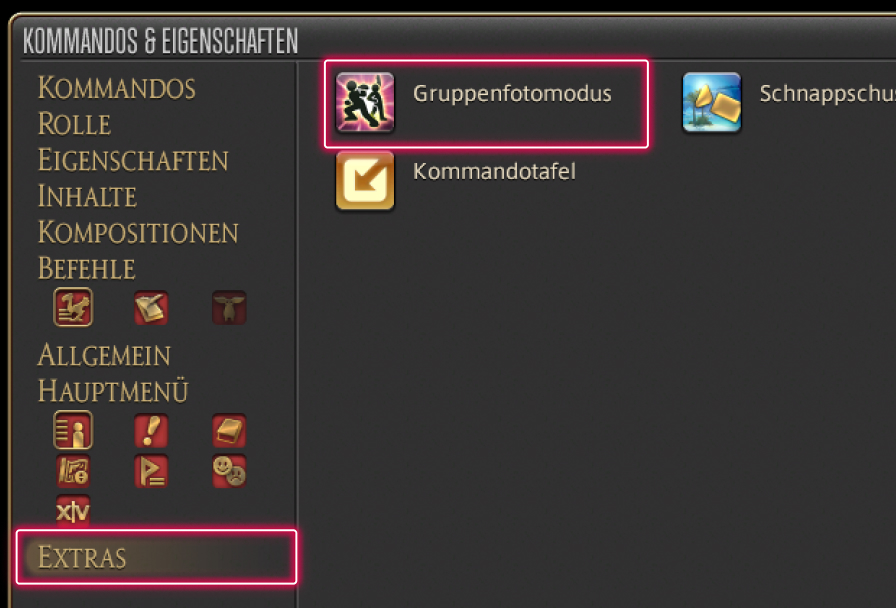 Öffne im Hauptmenü das Menü „Charakter" und dann „Kommandoliste". Unter „Extras“ findest du die Option „Gruppenfotomodus“.